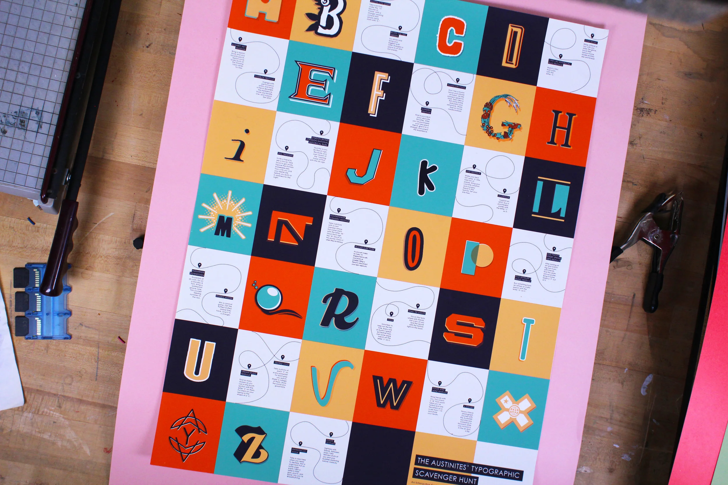Graphic design and illustration of an Austin Alphabet Poster. Users explore the greater Austin area and record their progress along the way through Instagram hashtag handles.
